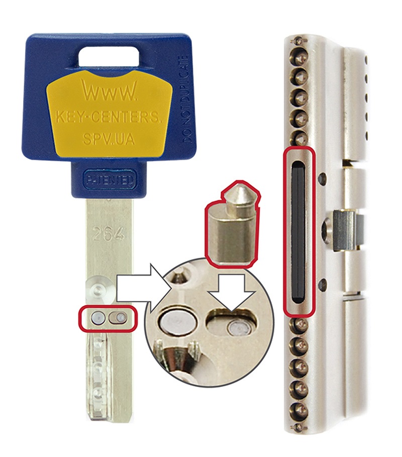 ► Інтерактивна (рухлива) вставка в ключі виключає можливість копіювання ключа та взаємодіє всередині циліндра з піном мінусової висоти